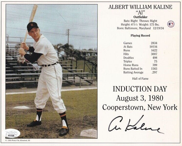 This autographed 8x10 photo has been personally hand-signed by Al Kaline of the Detroit Tigers. This autograph is certified by James Spence Authentication (JSA). Al Passed Away on April 6th, 2020, at the age of 85.It comes with the numbered hologram and matching Certificate of Authenticity.