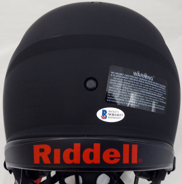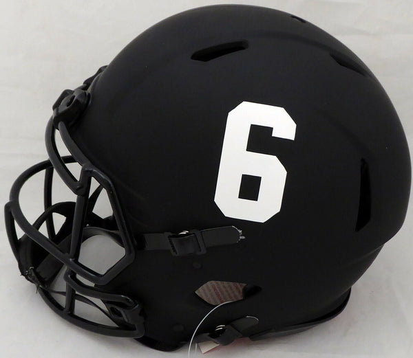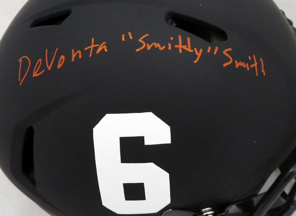 This is an Alabama Crimson Tide Eclipse Black Full Size Authentic Speed Helmet that has been hand signed by Devonta Smith. The Eclipse Black helmets are very delicate and often have some marks or scratches on them. This item was inscribed "Smitty." This item has been certified authentic by Beckett Authentication (BAS) and comes with their tamper-proof sticker and matching certificate of authenticity.