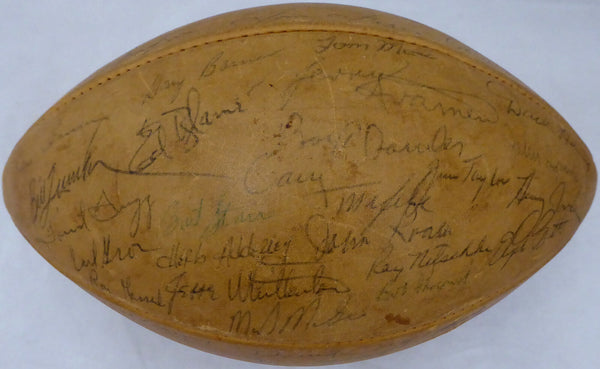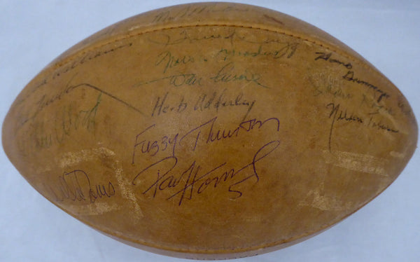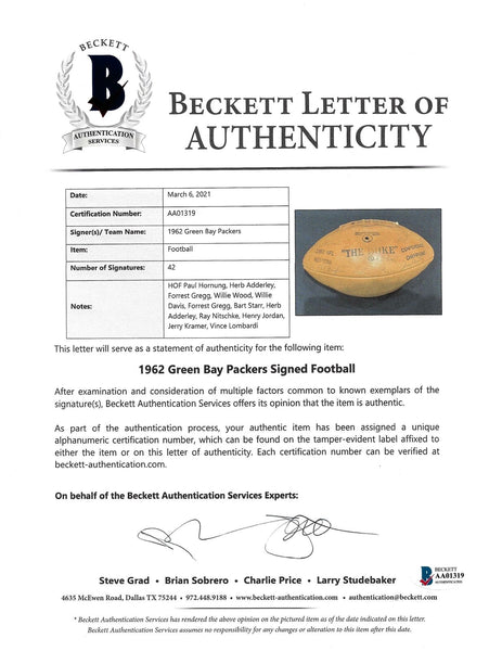 This is an Official Wilson Duke Football that has been hand signed by 42 members of the 1962 Green Bay Packers Championship Team. Signatures include: Vince Lombardi, Bart Starr, Ray Nitschke, Paul Hornung, Jim Taylor, Willie Wood, Willie Davis, Forrest Gregg, Henry Jordan, Fuzzy Thurston, Jerry Kramer & Herb Adderley.A It has been authenticated by Beckett (BAS) and comes with their sticker and matching full page certificate of authenticity.