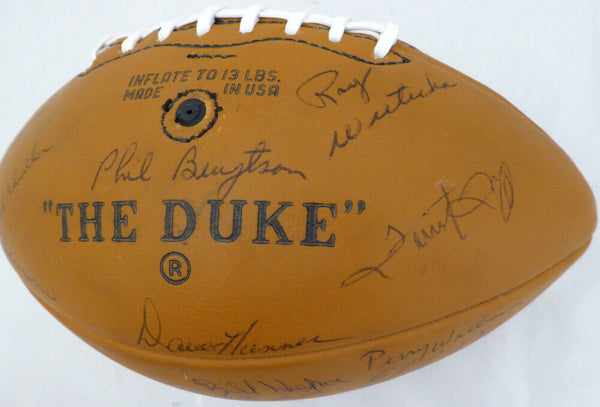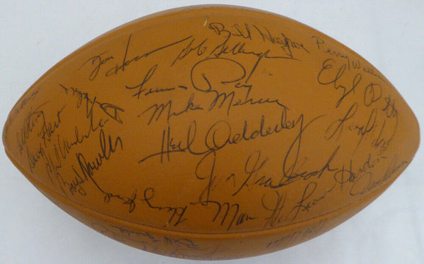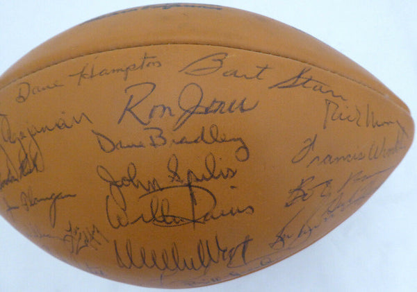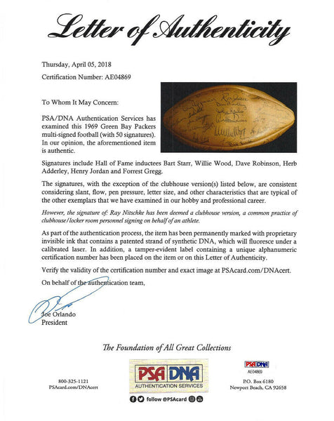 This is an official leather Wilson NFL Football that has been hand signed by 50 members of the 1969 Green Bay Packers NFL team. Signatures include: BART STARR, FORREST GREGG, WILLIE WOOD, DAVE ROBINSON, HENRY JORDAN & HERB ADDERLEY. NOTE: The signature of RAY NITSCHKE has been deemed a clubhouse version, a common practice of clubhouse/locker room personnel signing on behalf of the athlete. It has been authenticated by PSA/DNA and comes with their sticker and matching full page certificate of authenticity.
