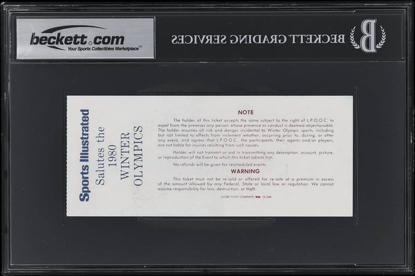 Featured is a 1980 USA Hockey team signed Czechoslovakia game ticket from February 14, 1980. On this day, Team USA defeated Czechoslovakia 7-3. This ticket has been hand signed by Jim Craig, Mike Eruzione, Buzz Schneider, Craig Patrick, Jack O'Callahan, Rob McClanahan, Neal Broten, Dave Silk, Phil Verchota, Steve Christoff, Mark Johnson, John Harrington, Eric Strobel, Dave Christian, Mark Pavelich, Mike Ramsey, Bill Baker, Ken Morrow, Mark Wells, and Steve Janaszak. This ticket has been authenticated and encapsulated by Beckett Grading Services, receiving an autograph grade of 10. This ticket would make a great addition to any sports memorabilia collection.. SPECIFICATIONS Autographed By: Team: USA Sport: Hockey Authentication: Beckett Grading Services