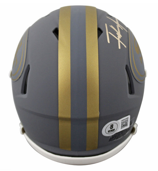 This Autographed Alternate Slate Speed Mini Helmet has been Personally Signed by Frank Gore of the San Francisco 49ers. This item is 100% Authentic to include a hologram by Beckett Authentication Services. This item will come with an affixed Beckett Authentication Services (BAS) authentication sticker, which includes a scannable QR code to verify authenticity. Please note that Beckett no longer provides serial-numbered COA cards, and the attached BAS sticker will serve as the complete authentication for this item. This is a BAS Witnessed Protection Program item which means a Beckett Authentication Service representative was present when this item was being signed. We conducted an autograph signing with Frank Gore where multiples of the same item were signed. While the photographs are representative of this item, the size, placement and strength of the signature may vary. Each item is hand signed, therefore, each autograph is unique. This item can be verified through BAS Witnessed.