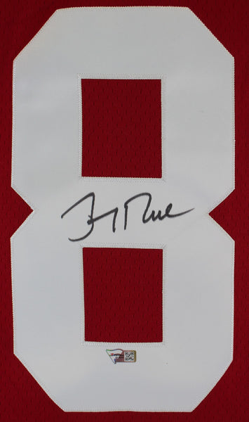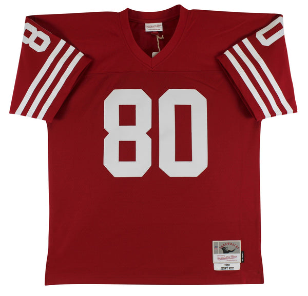 This Autographed Red Mitchell & Ness Jersey has been Personally Signed by Jerry Rice of the San Francisco 49ers. This item is 100% Authentic to includes a numbered hologram by Fanatics. We conducted an autograph signing with Jerry Rice where multiples of the same item were signed. While the photographs are representative of this item, the size, placement and strength of the signature may vary. Each item is hand signed, therefore, each autograph is unique. This item can be verified through Fanatics. This is a X-Large sized Jersey.