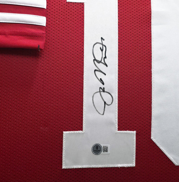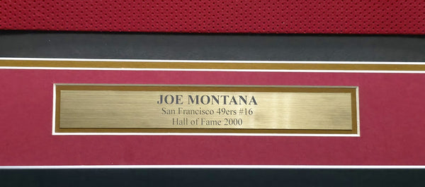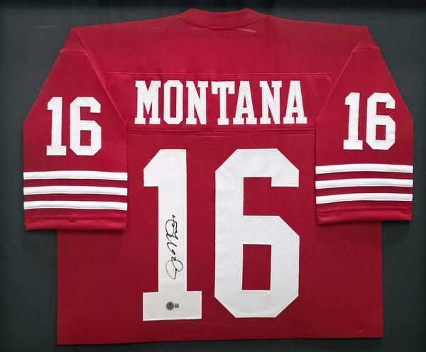 This is a Framed Red Jersey, approximately 31x36 with the frame, that has been hand signed by Joe Montana. This item has been certified authentic by Beckett Authentication (BAS) and comes with their tamper-proof QR Code hologram.