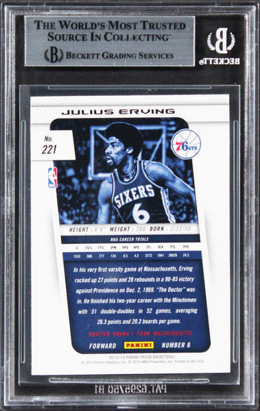 This Autographed 2013 Panini Prizm #221 Card has been Personally Signed by Julius Erving of the Philadelphia 76ers. This item is 100% Authentic, it comes slabbed and authenticated by Beckett Authentication Services. The authenticity can be verified on Beckett Authentication Services website.