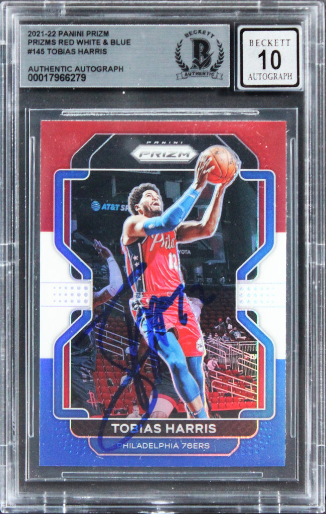 This Autographed Auto Graded Gem Mint 10! 2021 Panini Prizm Prizms Red White & Blue #145 Card has been Personally Signed by Tobias Harris of the Philadelphia 76ers. This item is 100% Authentic, it comes slabbed and authenticated by Beckett Authentication Services. The authenticity can be verified on Beckett Authentication Services website.