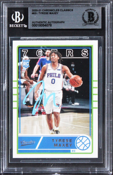 This Autographed 2020 Chronicles Classics #631 Rookie Card has been Personally Signed by Tyrese Maxey of the Philadelphia 76ers. This item is 100% Authentic, it comes slabbed and authenticated by Beckett Authentication Services. The authenticity can be verified on Beckett Authentication Services website.