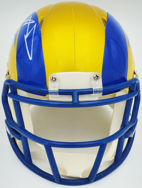 This is a Los Angeles Rams Flash Yellow Speed Mini Helmet that has been hand signed by Aaron Donald. The Flash helmets are delicate and may have some marks or scratches on them. This item has been witnessed and certified authentic by Beckett Authentication (BAS) and comes with their tamper-proof witness sticker.