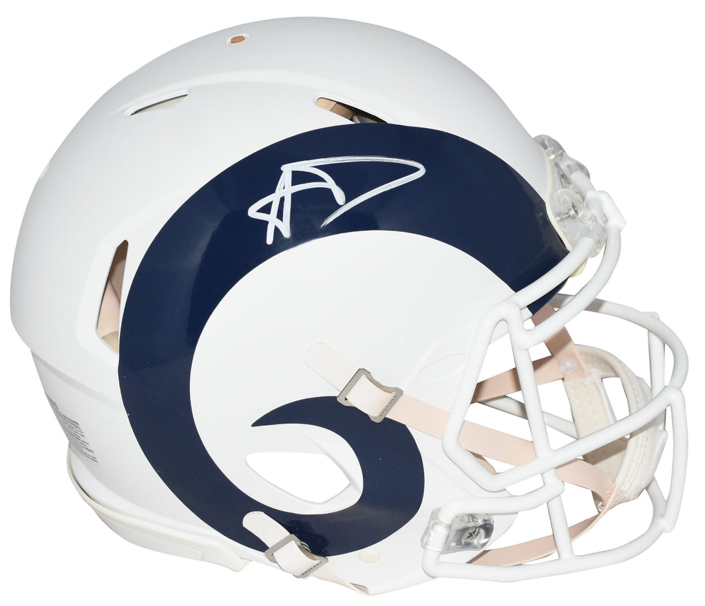 Aaron Donald, former All-Pro defensive tackle for the Los Angeles Rams, has hand signed this Rams Riddell Speed Flat White full-size authentic helmet at a private signing. This helmet is fully padded inside like the ones worn on the field. This item is authenticated by Beckett Authentication Services and was signed in the presence of one of their representatives. Their tamper-evident hologram featuring a QR code and serial number is on the item. The authenticity can be verified online by entering the serial number or scanning the QR code.Item pictured may not be the exact item you will receive. It will be similar quality, and we guarantee your satisfaction.