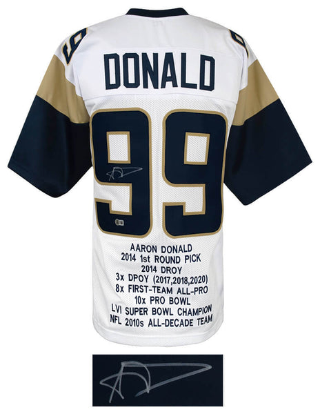 Aaron Donald signed white custom embroidered stat football jersey. Item comes with a Beckett Authentication tamper evident numbered sticker and matching Certificate of Authenticity which can be verified online. Jersey is size XL.
