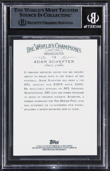 This Autographed 2014 Topps Allen & Ginter #118 Card with the inscription of "Best Wishes" has been Personally Signed by Adam Schefter. This item is 100% Authentic, it comes slabbed and authenticated by Beckett Authentication Services. The authenticity can be verified on Beckett Authentication Services website.