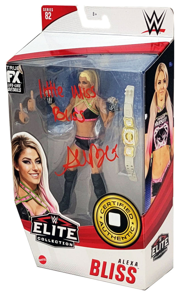This is a WWE Elite Collection #82 Action Figure that has been hand signed by Alexa Bliss. This item was inscribed "Little Miss Bliss." This item has been witnessed and certified authentic by Beckett Authentication (BAS) and comes with their tamper-proof witness sticker. Beckett Authentication has recently changed their physical certificate card policy where they no longer match their tamper-proof sticker with a physical certificate. A certificate can be printed on Beckett's website for the matching authentication number.