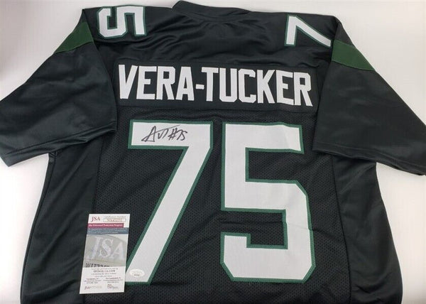 Custom on-field style jersey. Everything is sewn on, size XL. Hand-signed by Alijah Vera-Tucker.The autograph(s) includes an official James Spence Authentication (JSA) "Signature Debut" hologram and COA. "Signature Debut" is the autographed memorabilia equivalent to a rookie card. The JSA definition of a "Signature Debut" is as follows: "Any item that is autographed and received by JSA prior to the last game of the signer's official rookie season. Authentication: JSA COA