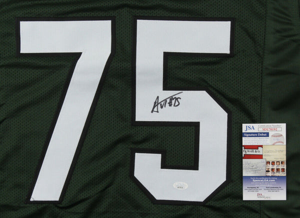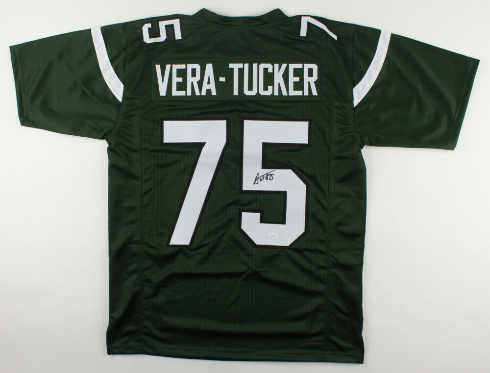 Custom on-field style jersey. Everything is sewn on, size XL. Hand-signed by Alijah Vera-Tucker.The autograph(s) includes an official James Spence Authentication (JSA) "Signature Debut" hologram and COA. "Signature Debut" is the autographed memorabilia equivalent to a rookie card. The JSA definition of a "Signature Debut" is as follows: "Any item that is autographed and received by JSA prior to the last game of the signer's official rookie season. Authentication: JSA COA