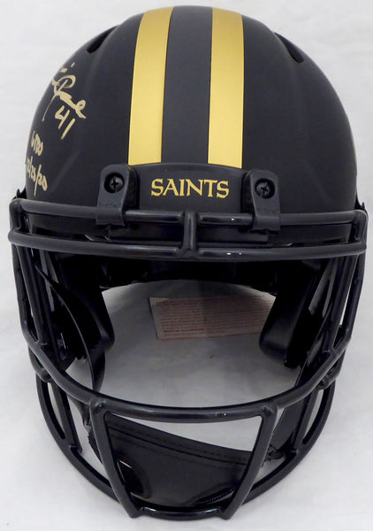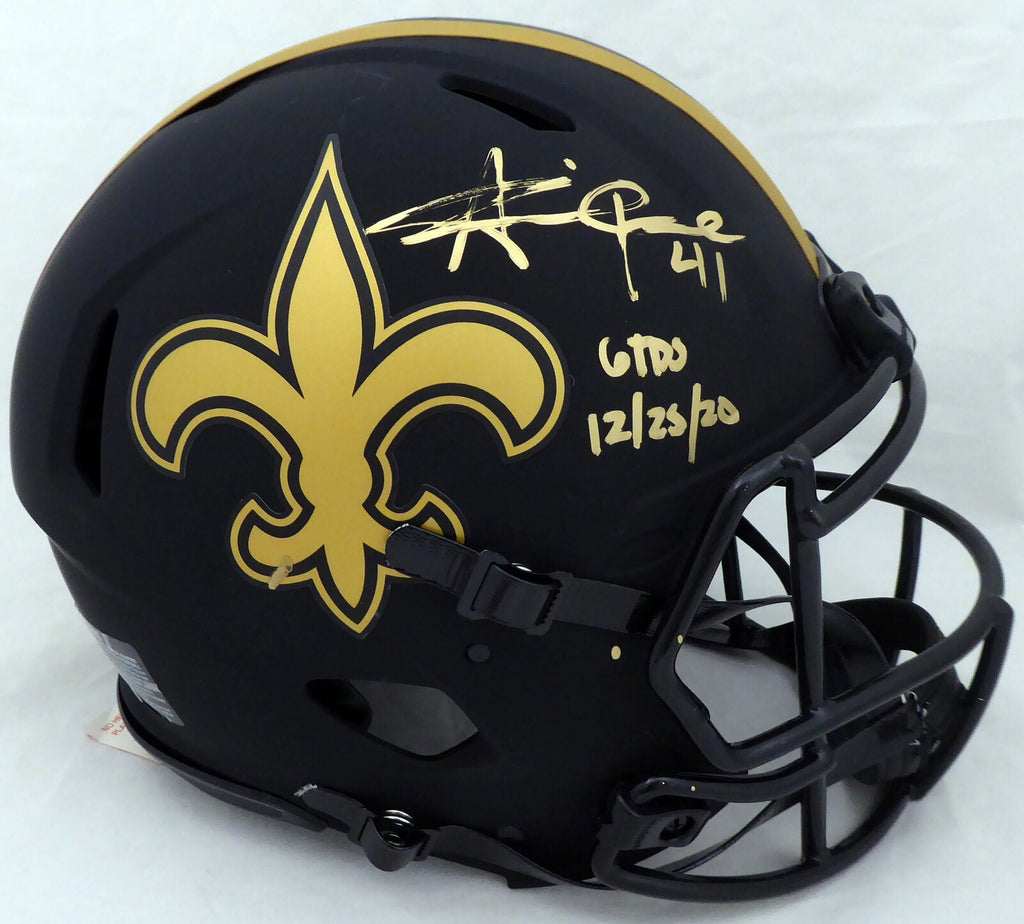 This is a New Orleans Saints Eclipse Black Full Size Authentic Speed Helmet that has been hand signed by Alvin Kamara. The Eclipse Black helmets are very delicate and often have some marks or scratches on them. This item was inscribed "6 TD's 12/25/20." This item has been certified authentic by Beckett Authentication (BAS) and comes with their tamper-proof QR Code sticker that can be verified on the Beckett-authentication.com.A NOTE: The signature is a little streaky, as shown in the pictures.