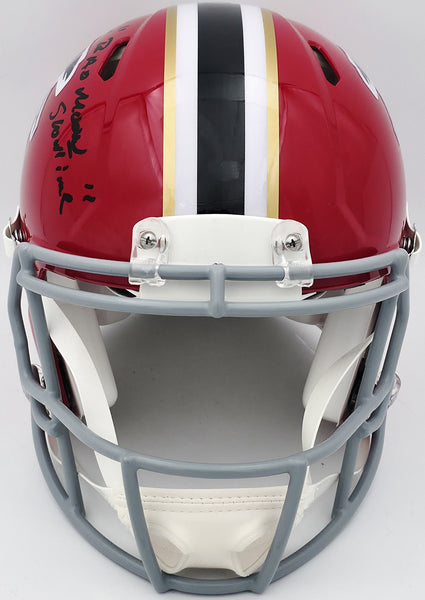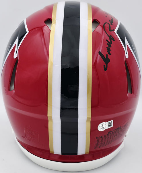 This is an Atlanta Falcons 1966-69 Throwback Red Full Size Authentic Speed Helmet that has been hand signed by Andre Rison. This item was inscribed "Bad Moon, Showtime." This item has been witnessed and certified authentic by Beckett Authentication (BAS) and comes with their tamper-proof witness hologram.