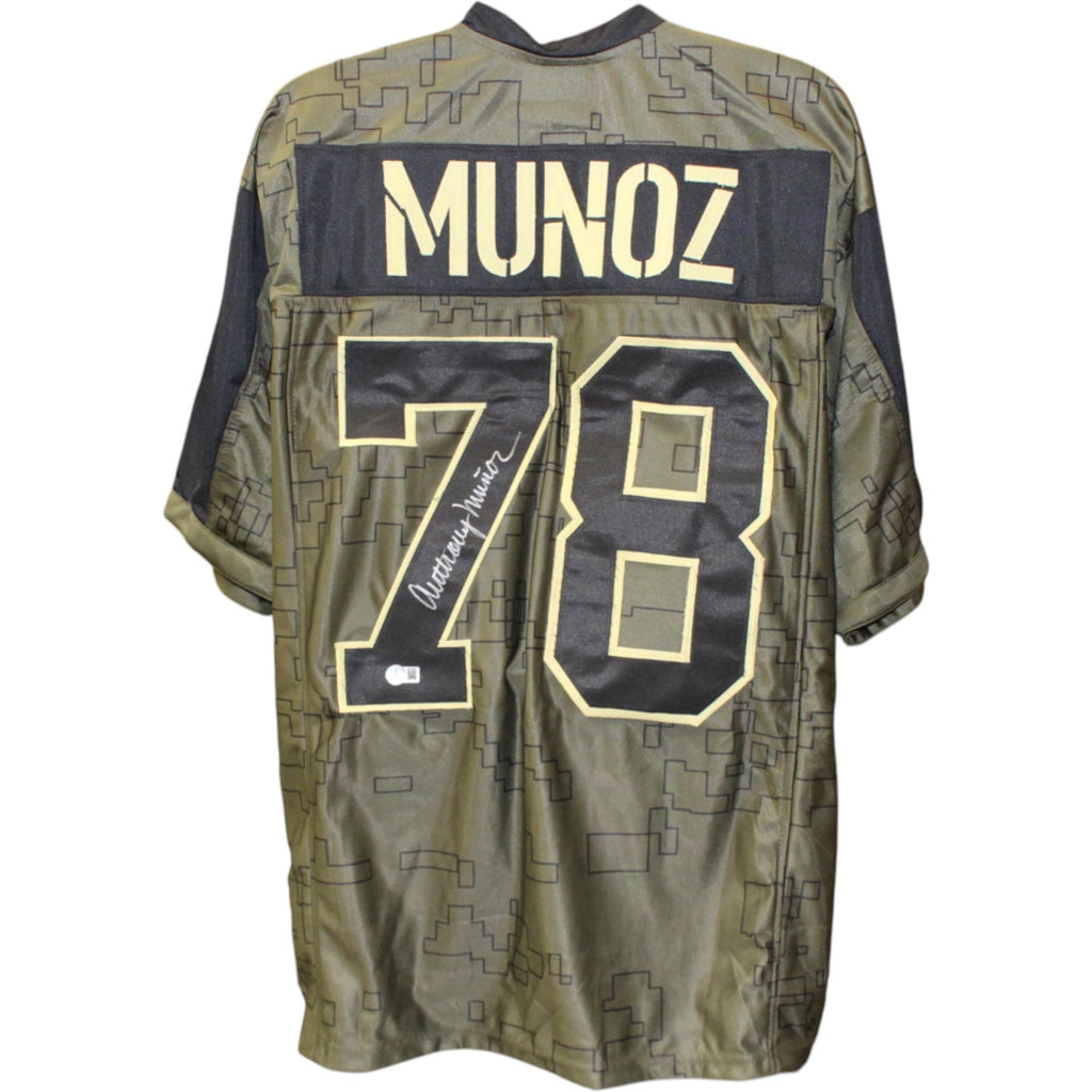 The number in the listing title is just an inventory sku for our records and is not the authentication number. The item pictured is a stock photo unless otherwise noted. This is a Pro Style Salute to Service Size XL Jersey with sewn on numbers that was personally autographed by Anthony Munoz. Includes a certificate of authenticity from Beckett Authentication Services (BAS) and Denver Autographs.