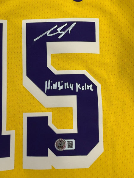 Celebrate one of the Lakers rising stars with this Austin Reaves autographed Los Angeles Lakers Nike Swingman jersey featuring the team's classic gold design. Reaves added the HILLBILLY KOBE inscription a nod to the nickname fans embraced early in his career. This official Nike Swingman jersey is hand-signed by Austin Reaves and comes Beckett Witness Authenticated featuring a unique Beckett hologram that can be verified online for signature confirmation. The hologram serves as the certification. Jersey is a size L or XXL.Stock image.