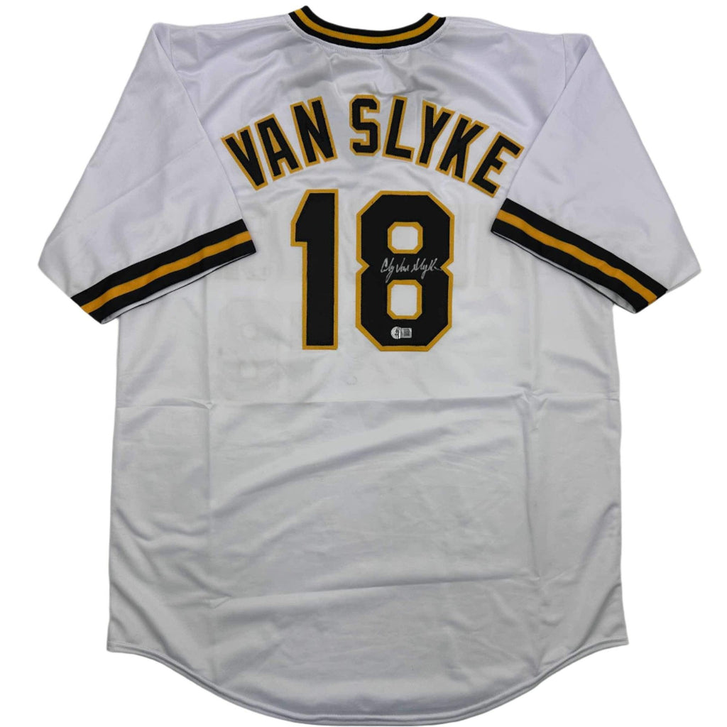 Autographed/Signed Andy Van Slyke Pittsburgh White Jersey Beckett BAS COA Jersey has no brand names or logos. This is a custom jersey and was not manufactured by or in any manner associated with any professional sports league or manufacturer. This custom jersey carries no professional sports league designation. The item is intended to be an autographed collectible. The custom jersey displays the name and number of the player. This item in no way is affiliated with or connected to any professional sports organization. Size is XL.