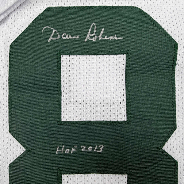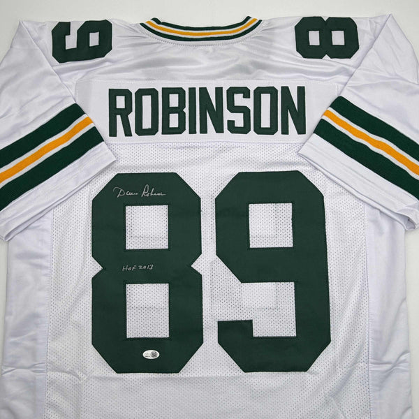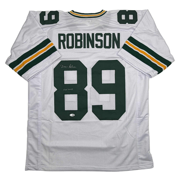 Autographed/Signed Dave Robinson HOF 13 Green Bay White Football Jersey JSA COA Jersey has no brand names or logos. This is a custom jersey and was not manufactured by or in any manner associated with any professional sports league or manufacturer. This custom jersey carries no professional sports league designation. The item is intended to be an autographed collectible. The custom jersey displays the name and number of the player. This item in no way is affiliated with or connected to any professional sports organization. Size is XL.