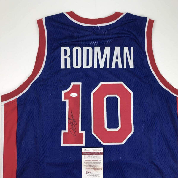Autographed/Signed Dennis Rodman Detroit Blue Basketball Jersey JSA COA Jersey has no brand names or logos. This is a custom jersey and was not manufactured by or in any manner associated with any professional sports league or manufacturer. This custom jersey carries no professional sports league designation. The item is intended to be an autographed collectible. The custom jersey displays the name and number of the player. This item in no way is affiliated with or connected to any professional sports organization. Size is XL.