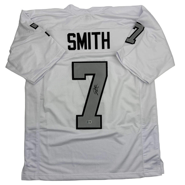 Autographed/Signed Geno Smith Oakland White Color Rush Jersey Beckett BAS COA Jersey has no brand names or logos. This is a custom jersey and was not manufactured by or in any manner associated with any professional sports league or manufacturer. This custom jersey carries no professional sports league designation. The item is intended to be an autographed collectible. The custom jersey displays the name and number of the player. This item in no way is affiliated with or connected to any professional sports organization. Size is XL.