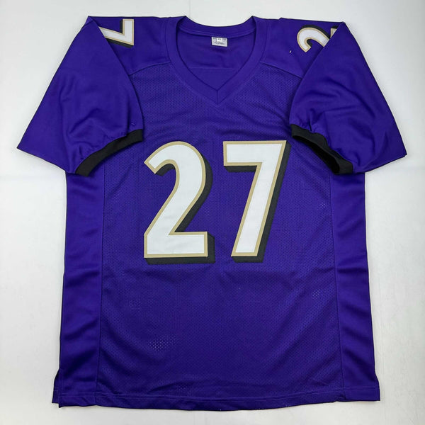 Autographed/Signed J.K. Dobbins Baltimore Purple Football Jersey JSA COA Jersey has no brand names or logos. This is a custom jersey and was not manufactured by or in any manner associated with any professional sports league or manufacturer. This custom jersey carries no professional sports league designation. The item is intended to be an autographed collectible. The custom jersey displays the name and number of the player. This item in no way is affiliated with or connected to any professional sports organization. Size is XL.