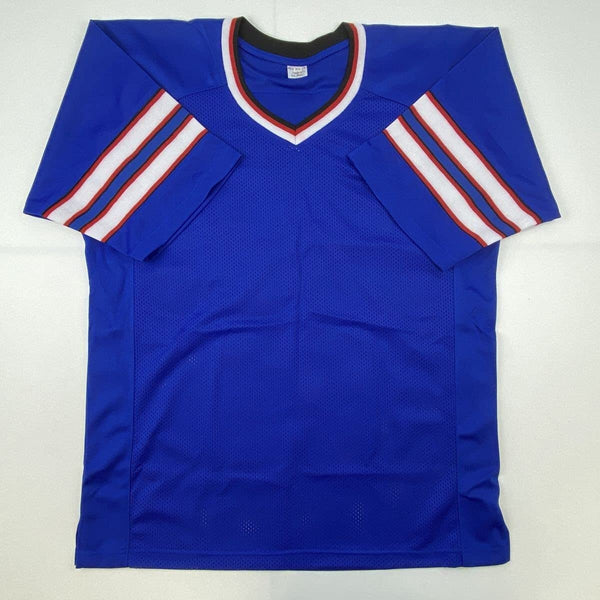Autographed/Signed Jim Kelly Thurman Thomas Andre Reed Dynasty Jersey JSA COA Jersey has no brand names or logos. This is a custom jersey and was not manufactured by or in any manner associated with any professional sports league or manufacturer. This custom jersey carries no professional sports league designation. The item is intended to be an autographed collectible. The custom jersey displays the name and number of the player. This item in no way is affiliated with or connected to any professional sports organization. Size is XL.
