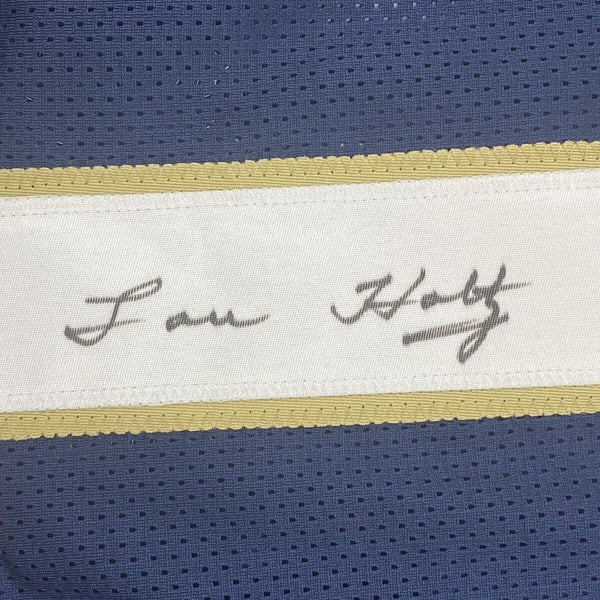 Autographed/Signed LOU HOLTZ Notre Dame Blue College Football Jersey JSA COA This is a custom jersey and was not manufactured by or in any manner associated with any professional sports league or manufacturer. This custom jersey carries no professional sports league designation. The item is intended to be an autographed collectible. Reference of team in the title is to allow the purchaser a point of association. The custom jersey displays the name, number and authenticated signature of the player. This item in no way is affiliated with or connected to any professional sports organization. The autograph, as always is guaranteed to be authentic and has been certified as authentic by a third-party, trusted authenticator. Size is XL unless otherwise noted.