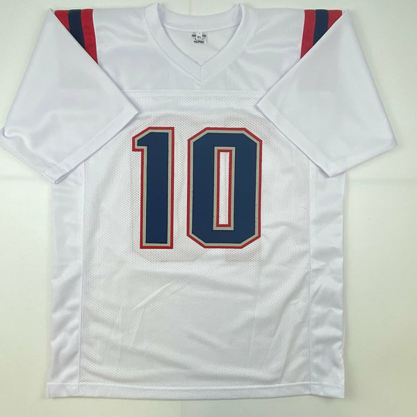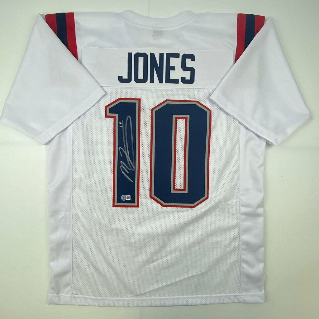 Autographed/Signed Mac Jones New England White Football Jersey Beckett BAS COA Jersey has no brand names or logos. This is a custom jersey and was not manufactured by or in any manner associated with any professional sports league or manufacturer. This custom jersey carries no professional sports league designation. The item is intended to be an autographed collectible. The custom jersey displays the name and number of the player. This item in no way is affiliated with or connected to any professional sports organization. Size is XL.