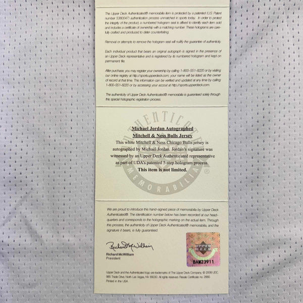 Autographed/Signed Michael Jordan Chicago Basketball Jersey Upper Deck UDA COA Jersey has no brand names or logos. This is a custom jersey and was not manufactured by or in any manner associated with any professional sports league or manufacturer. This custom jersey carries no professional sports league designation. The item is intended to be an autographed collectible. The custom jersey displays the name and number of the player. This item in no way is affiliated with or connected to any professional sports organization. Size is XL.