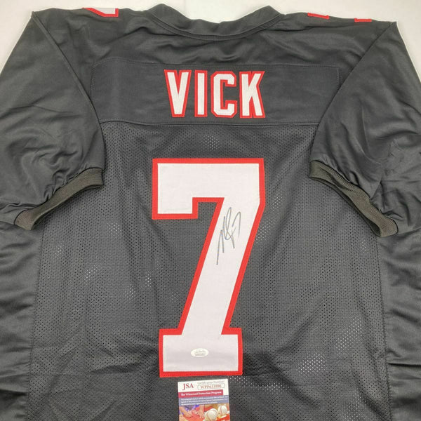 Autographed/Signed MICHAEL MIKE VICK Atlanta Retro Black Football Jersey JSA COA This is a custom jersey and was not manufactured by or in any manner associated with any professional sports league or manufacturer. This custom jersey carries no professional sports league designation. The item is intended to be an autographed collectible. Reference of team in the title is to allow the purchaser a point of association. The custom jersey displays the name, number and authenticated signature of the player. This item in no way is affiliated with or connected to any professional sports organization. The autograph, as always is guaranteed to be authentic and has been certified as authentic by a third-party, trusted authenticator. Size is XL unless otherwise noted.