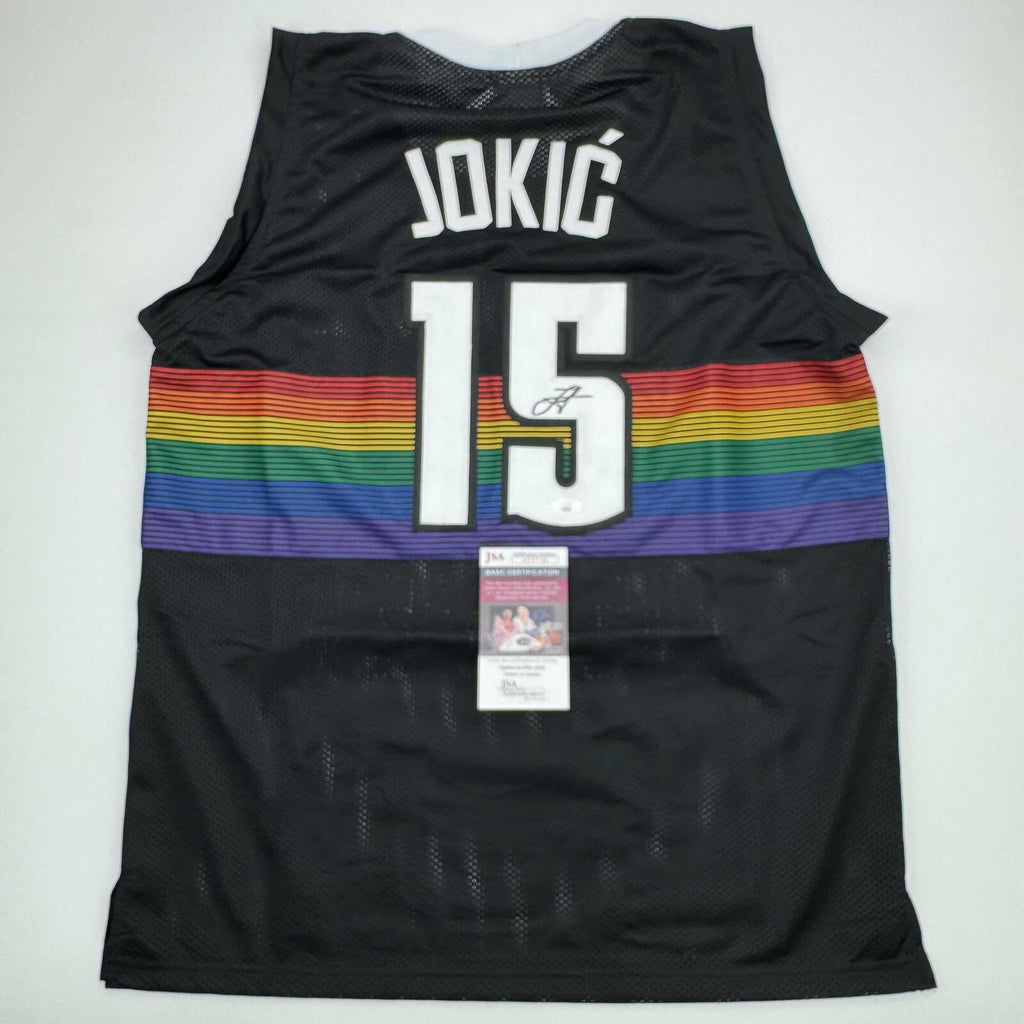 Autographed/Signed Nikola Jokic Denver Black Rainbow Basketball Jersey JSA COA Jersey has no brand names or logos. This is a custom jersey and was not manufactured by or in any manner associated with any professional sports league or manufacturer. This custom jersey carries no professional sports league designation. The item is intended to be an autographed collectible. The custom jersey displays the name and number of the player. This item in no way is affiliated with or connected to any professional sports organization. Size is XL.