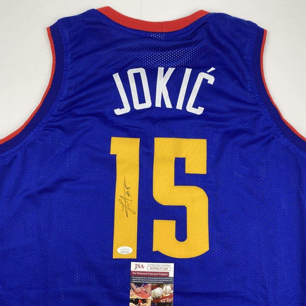 Autographed/Signed Nikola Jokic Denver Royal Blue Basketball Jersey JSA COA Jersey has no brand names or logos. This is a custom jersey and was not manufactured by or in any manner associated with any professional sports league or manufacturer. This custom jersey carries no professional sports league designation. The item is intended to be an autographed collectible. The custom jersey displays the name and number of the player. This item in no way is affiliated with or connected to any professional sports organization. Size is XL.