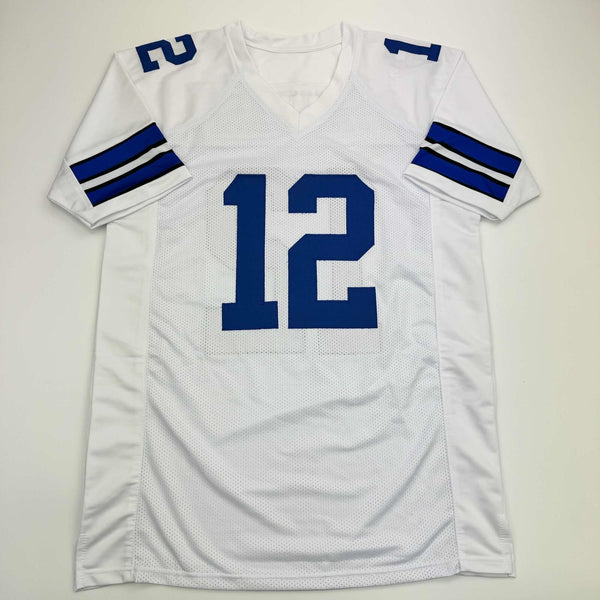 Autographed/Signed Roger Staubach Dallas White Football Jersey Beckett BAS COA Jersey has no brand names or logos. This is a custom jersey and was not manufactured by or in any manner associated with any professional sports league or manufacturer. This custom jersey carries no professional sports league designation. The item is intended to be an autographed collectible. The custom jersey displays the name and number of the player. This item in no way is affiliated with or connected to any professional sports organization. Size is XL.