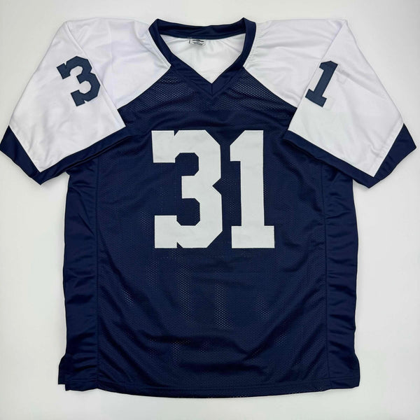 Autographed/Signed Roy Williams Dallas Thanksgiving Football Jersey JSA COA Jersey has no brand names or logos. This is a custom jersey and was not manufactured by or in any manner associated with any professional sports league or manufacturer. This custom jersey carries no professional sports league designation. The item is intended to be an autographed collectible. The custom jersey displays the name and number of the player. This item in no way is affiliated with or connected to any professional sports organization. Size is XL.