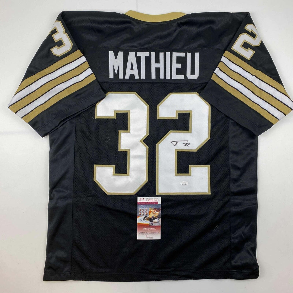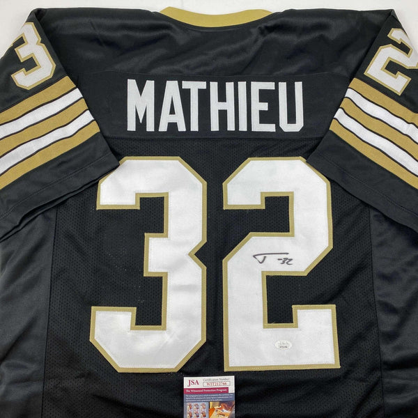 Autographed/Signed Tyrann Mathieu New Orleans Black Football Jersey JSA COA Jersey has no brand names or logos. This is a custom jersey and was not manufactured by or in any manner associated with any professional sports league or manufacturer. This custom jersey carries no professional sports league designation. The item is intended to be an autographed collectible. The custom jersey displays the name and number of the player. This item in no way is affiliated with or connected to any professional sports organization. Size is XL.