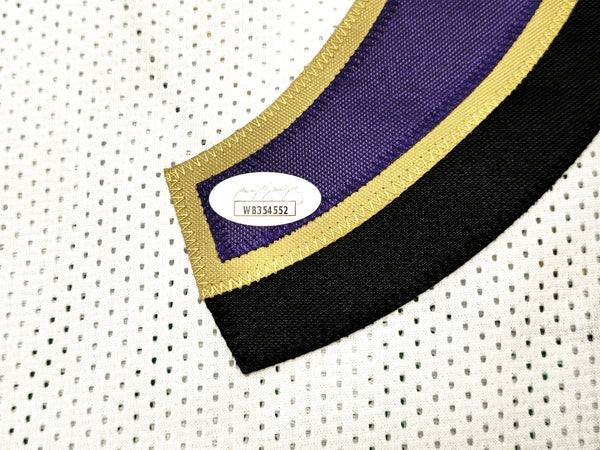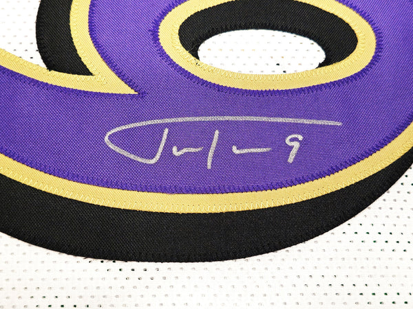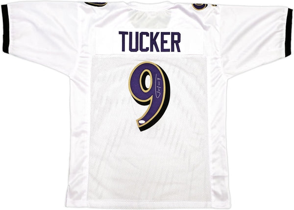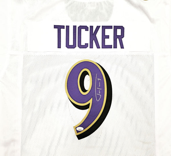 This is a White Jersey that has been hand signed by Justin Tucker. This is a custom jersey with no name brand. The approximate size is XL. It has nice sewn in name and numbers. This item has been certified authentic by JSA and comes with their tamper-proof sticker and matching certificate of authenticity.