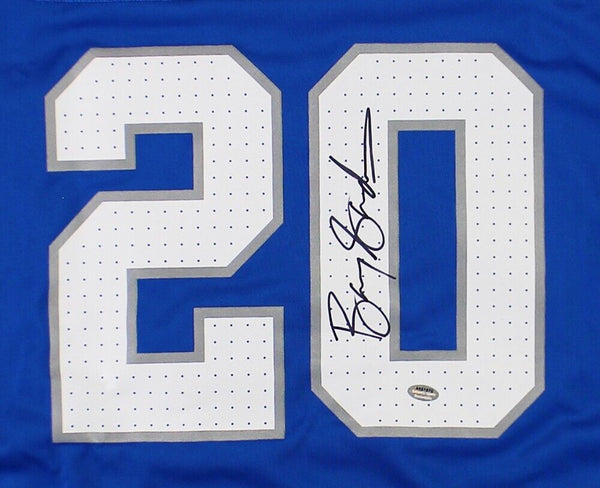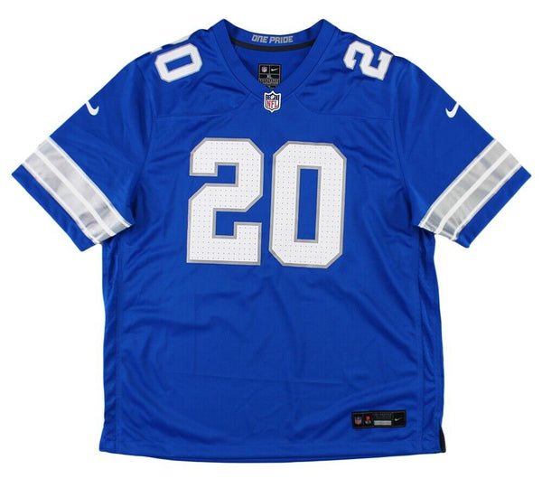 A Detroit Lions Nike Blue Jersey hand signed by Barry Sanders. The item and signature are in excellent condition. Barry is a 10x Pro Bowler, 10x All-Pro, 4x Rushing Champion, and NFL MVP. AUTHENTICATION: The item is accompanied by a Schwartz Sports Certificate of Authenticity - Schwartz Sports Serial Numbered & Databased Hologram.