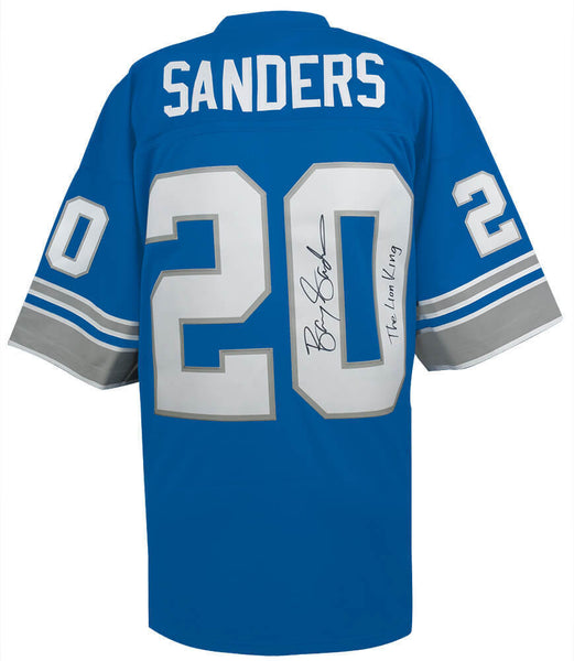 Barry Sanders Signed Detroit Lions blue 1996 throwback Mitchell & Ness NFL Legacy football jersey with 'The Lion King' inscription. Item comes with a Schwartz Sports Memorabilia tamper-proof numbered hologram and Certificate of Authenticity which can be verified online.