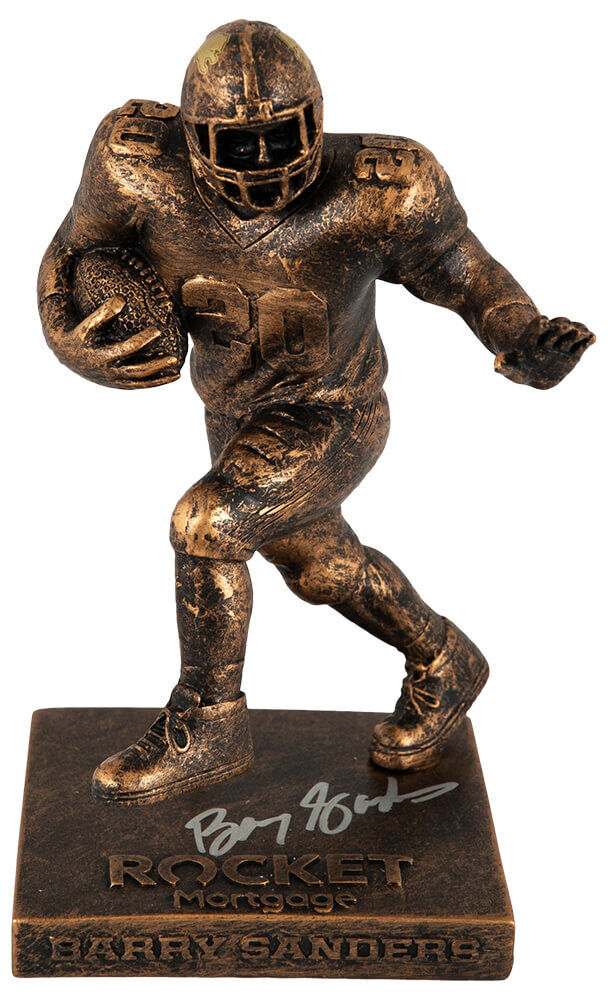 Barry Sanders signed Detroit Lions Rocket Mortgage replica football statue. Item comes with a Schwartz Sports Memorabilia tamper-proof numbered hologram and Certificate of Authenticity which can be verified online.