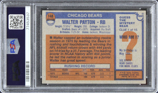 This is a 1976 Topps #148 Rookie Graded VG-EX-4 Card of Walter Payton of the Chicago Bears. This item is 100% Authentic, it comes slabbed and authenticated by PSA. This item is not autographed. The authenticity can be verified on Professional Sports Authenticator website.
