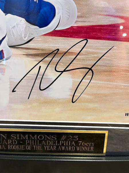 Showcase Philadelphia's standout with this limited edition Ben Simmons autographed 16x20 photo, numbered 115/125 and authenticated by Upper Deck Authenticated (UDA). Professionally framed to a commanding 30x22 with deep navy matting and a legacy-style frame--ideal for any sports display. Key Features: Player: Ben Simmons - former Philadelphia 76ers Signature: Bold autograph on 16x20 print Edition: #115 of 125 Authentication: UDA hologram & COA Frame: 30x22 (black/blue mat, museum-quality display) Condition: Excellent; framed as is A treasured limited-edition piece for collectors of NBA history and Simmons memorabilia