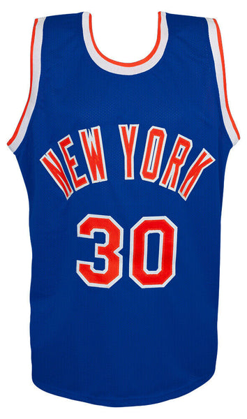 Bernard King signed blue throwback custom basketball jersey with 'HOF 2013' inscription. Item comes with a Schwartz Sports Memorabilia tamper-proof numbered hologram and Certificate of Authenticity which can be verified online. Jersey is size XL.