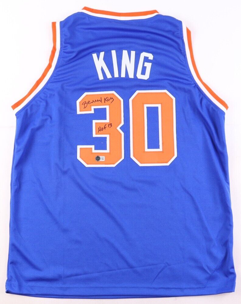 Custom jersey with everything sewn on, size XL. Has been hand-signed and inscribed by Bernard King (HOF).The autograph includes an official Beckett Authentication Services serially numbered hologram and QR Code card for authenticity purposes. The signing of this item was witnessed by Beckett.Authentication: Beckett QR Code card