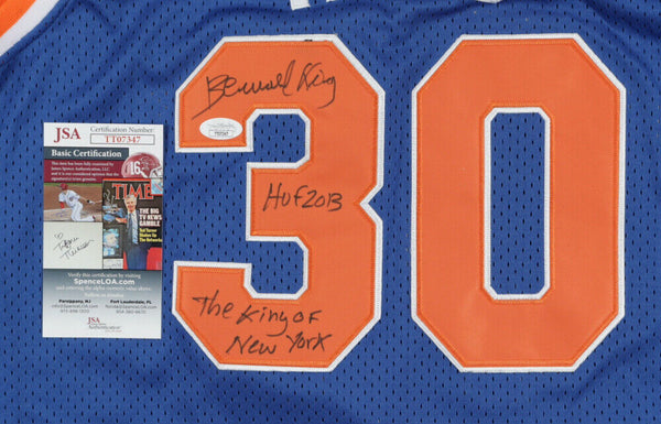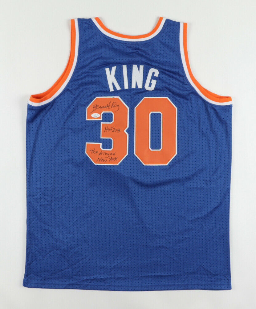 Custom on-court style jersey. Everything is sewn on size XL. Hand-signed by Bernard King (HOF).The lot / autograph(s) includes an official James Spence Authentication (JSA) hologram and matching COA for authenticity purposes.Authentication: JSA COA