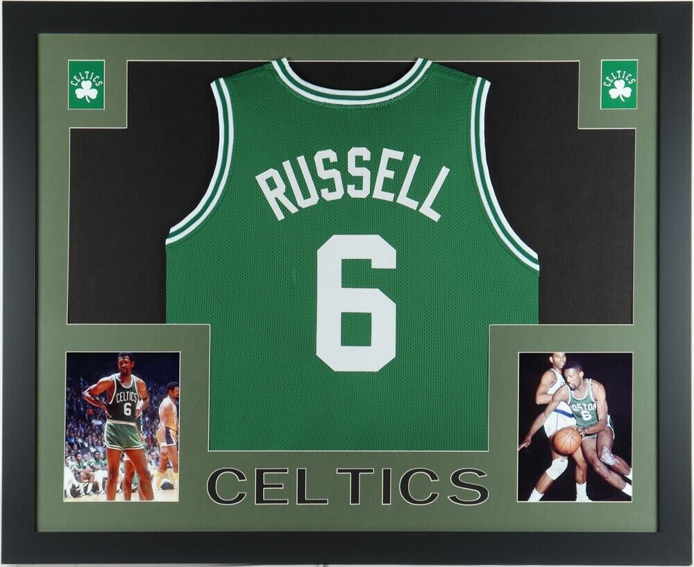 Custom frame measures approximately 35" x 43" in size and features a jersey of Bill Russell. Please note, the display is unsigned.
