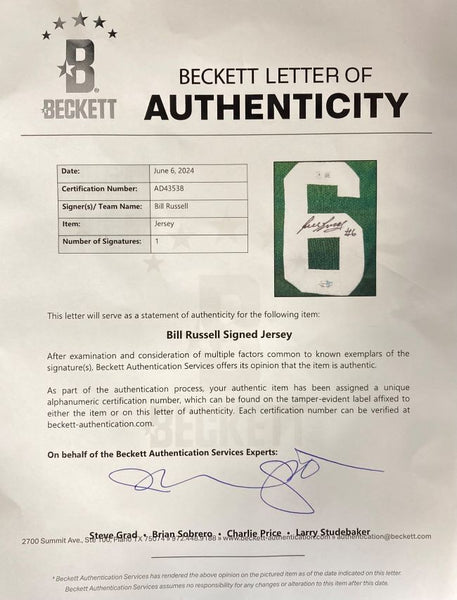 Featured is a Bill Russell signed custom basketball jersey. This jersey was hand signed by Russell and comes with the Beckett hologram and letter of authenticity. This jersey features professionally sewn letters and numbers and is size XL. This jersey has no team tags or emblems and is intended as a sports collectible.. SPECIFICATIONS Autographed By: Bill Russell Team: Boston Celtics Sport: Basketball Authentication: Beckett Grading Services