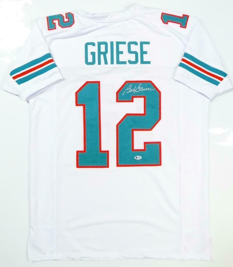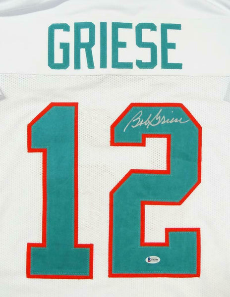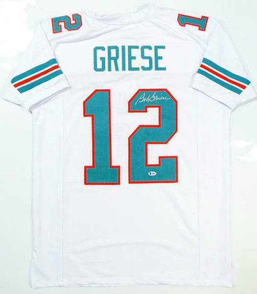 Bob Griese Autographed White Pro Style Jersey- Beckett Auth *2 THIS IS NOT AN NFL JERSEY. THIS HAS NO TAGS, NO LOGOS, NO EMBLEMS. This is a hand autograph of Bob Griese on a custom made (Non Name Brand) authentic style jersey with stitched letters and numbers. This item has a Beckett Authentication, which comes with a numbered Beckett and a matching Certificate of Authenticity. You can view this item on the Beckett Authentication website. It was signed either at a public autograph appearance or a private signing. This is a stock photo of the item. Although you may not receive this exact item, the item you receive is virtually identical and brand new in great shape. Jersey size is XL.