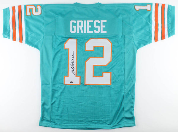 Custom on-field style jersey. Everything is sewn on, size XL. Hand-signed by Bob Griese (HOF). The lot / autograph(s) includes an official Schwartz Sports Hologram and matching COA for authenticity purposes.Authentication: Schwartz Sports COACustom on-field style jerseys are a more affordable option for autograph seekers. These jerseys do not have any brand name or tags and are made in the Philippines. They feature stitched on names and numbers and are made to look very similar to the on-field jerseys that the players wear. These custom jerseys are very commonly used in the memorabilia industry.